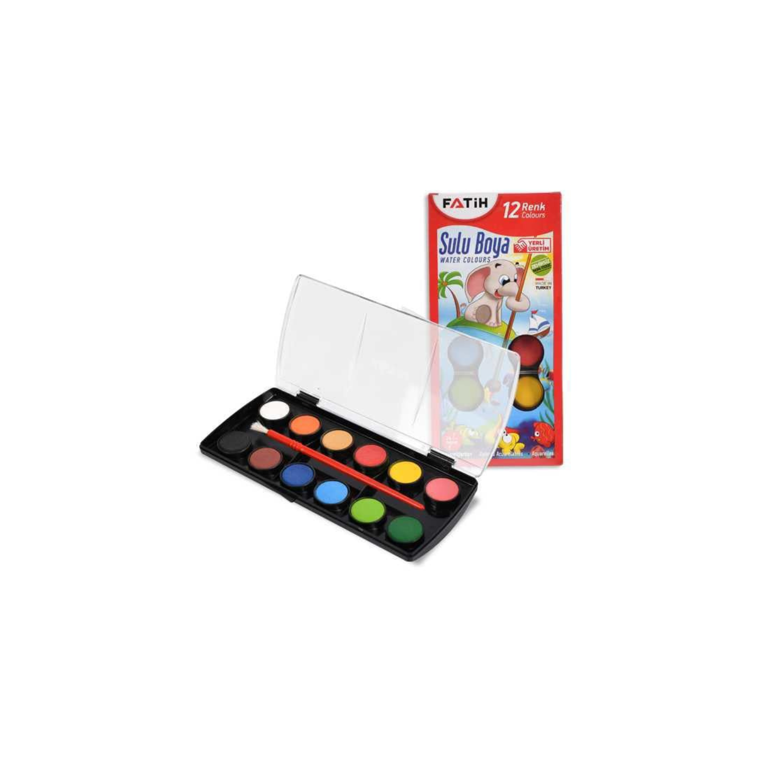 Акварелни бои FATIH с 12 цвята и включена четка. Подходящи за ученици и творчески занимания.