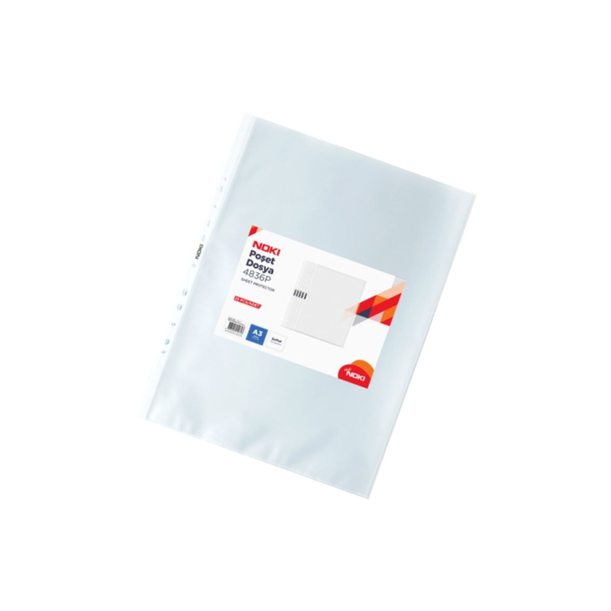 Комплект от 25 броя прозрачни джобове с перфорация NOKI, формат A3, предназначени за защита и подреждане на документи, чертежи, проекти и презентации. Джобовете са изработени от качествена и устойчива пластмаса, която предпазва съдържанието от намачкване, прах и замърсяване.